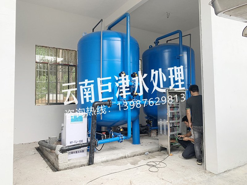 工藝流程:山泉水-二氧化氯加藥器-絮凝投加器-石英砂過(guò)濾器-用水點(diǎn)